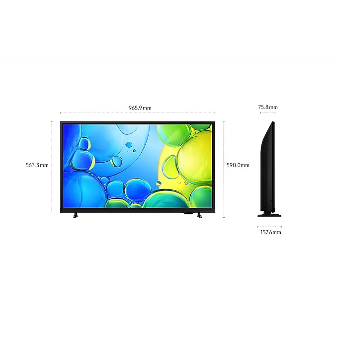 | Dimension | Set Size with Stand (WxHxD) – 965.9 x 590.0 x 157.6 mm Set Size without Stand (WxHxD) – 965.9 x 563.3 x 75.8 mm Stand (Basic) (WxD) – 648.9 x 157.6 mm |